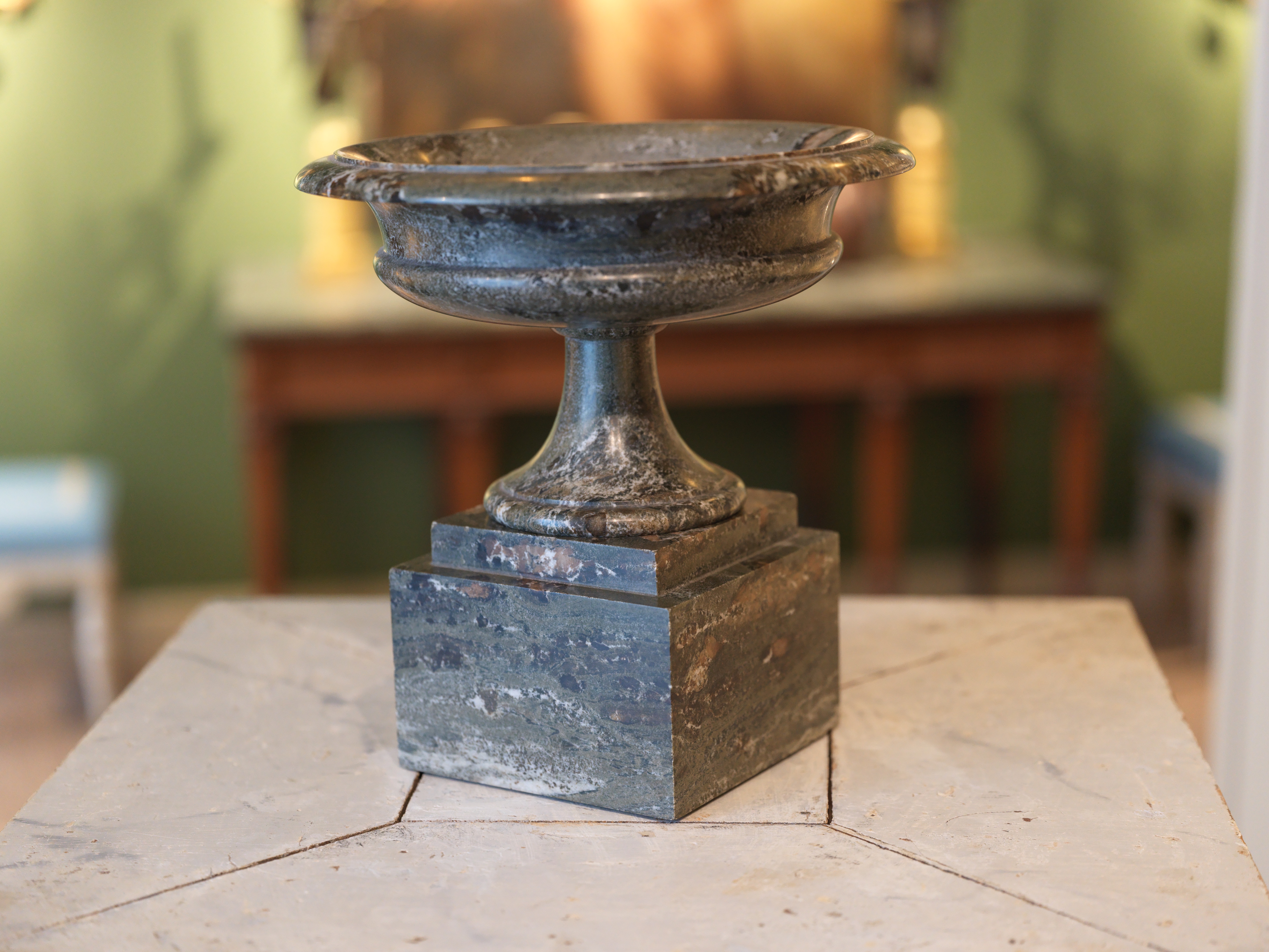 Ursprung: Ovanlig tazza på fyrkantigt postament av grön Kolmårdsmarmor. Tillverkad omkring år 1830. Påminner mycket i formen om den såkallade "Rosendalsvasen" av porfyr som än idag står utanför Rosendals Slott på Djurgården i Stockholm.